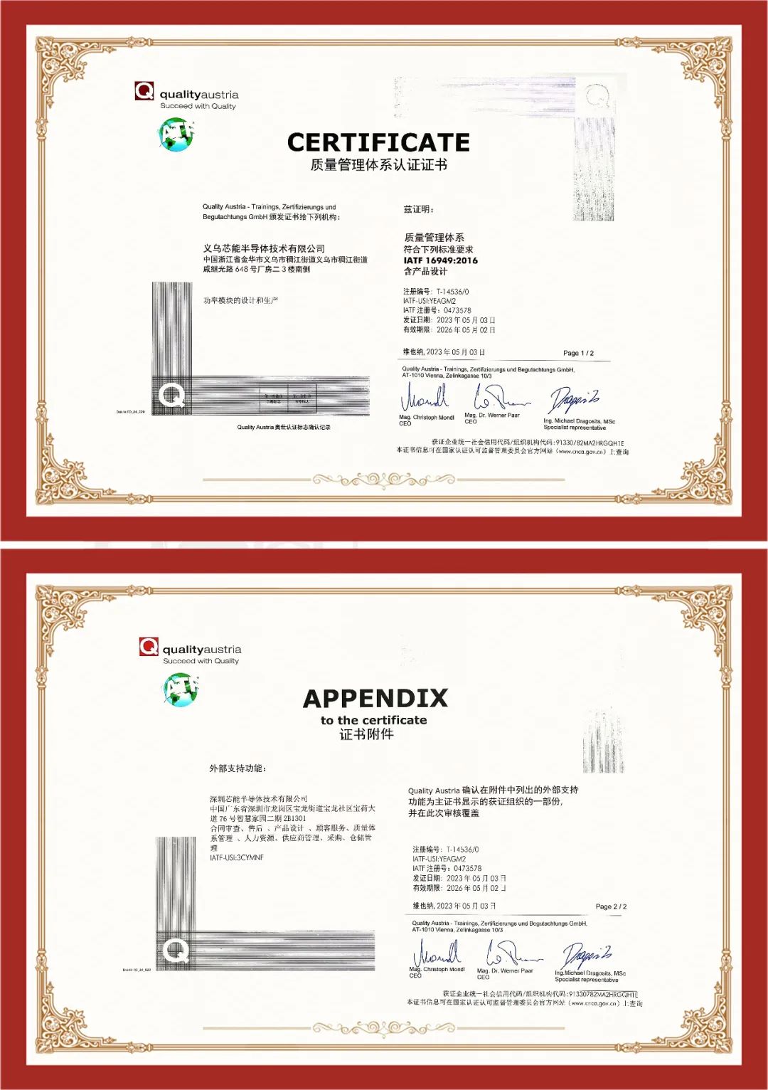 經(jīng)第三方認證機構嚴格審核,芯能半導體于2023年5月3日正式獲得IATF16949汽車(chē)行業(yè)質(zhì)量管理體系認證,為全方位服務(wù)國內外汽車(chē)客戶(hù)更好的保駕護航。